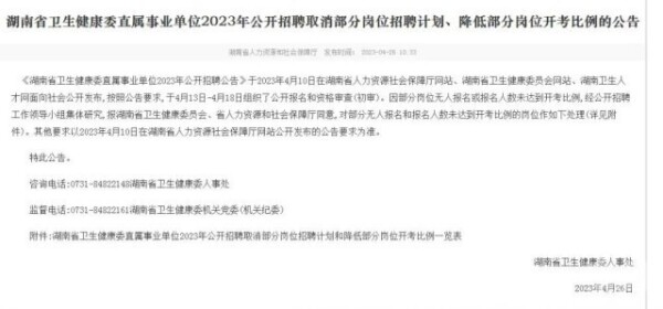 湖南省卫健委发布的取消部分岗位招聘计划和降低部分岗位开考比例的公告。