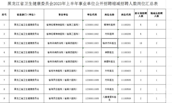 15日,上游新闻记者在黑龙江省卫生健康委员会官网发现,今年3月,黑龙江卫健委曾发布2023年度所属事业单位公开招聘工作人员公告,面向社会公开招聘编制内工作人员143名。公告计划表可以看到各单位具体招聘人员数量和要求。从学历来看,普遍要求全日制本科及以上,部分岗位除要求具备相应资格外,还要求相应医师规培证。此后,黑龙江卫健委又发布了该考试招聘取消、缩减部分岗位招聘计划公告。从相关表格来看,取消了15个岗位,比如黑龙江省神经精神病医院的急诊科医师、介入科医师等,黑龙江省传染病防治院临床外科医生、放疗科医生。从缩减岗位来看,一些计划招聘多人的岗位,缩减后普遍只招聘1-2人,如黑龙江省神经精神病医院各招聘精神科医师、内科医师5名,缩减后各招聘2人、1人;黑龙江省传染病防治院临床内科医生岗,原计划招聘18人,缩减后招聘2人。