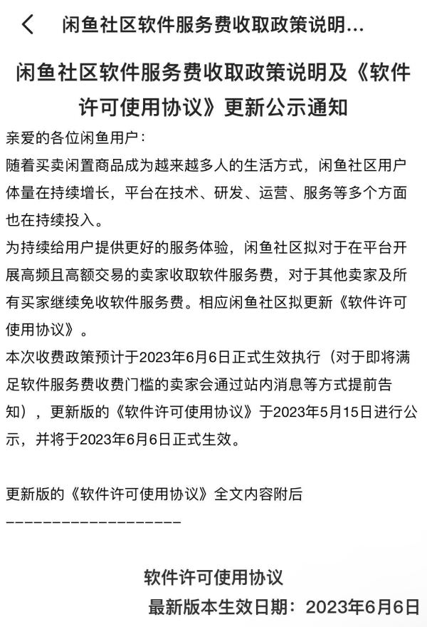 导读:5月16日,闲鱼社区拟对于在平台开展高频且高额交易的卖家收取软件服务费,对于其他卖家及所有买家继续免收软件服务费。预计于6月6日正式生效执行。