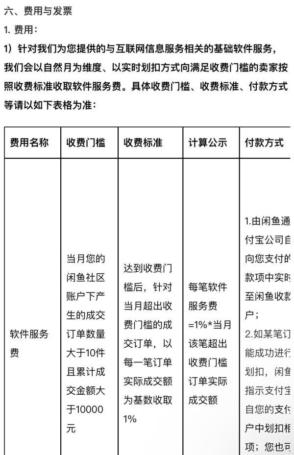 具体收费标准是当月闲鱼社区账户下产生的成交订单数量大于10件且累计成交金额大于10000 元,达到收费门槛后,针对当月超出收费门槛的成交订单,以每一笔订单实际成交额为基数收取1%。