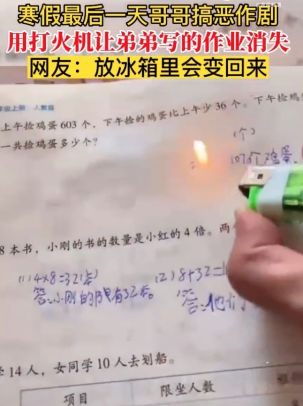 导读:近日,湖南。哥哥在寒假前的最后一天,用打火机烤弟弟辛辛苦苦做完的寒假作业,只见火苗所到之处,字迹随之消失。网友表示:放冰箱还会变回来的。