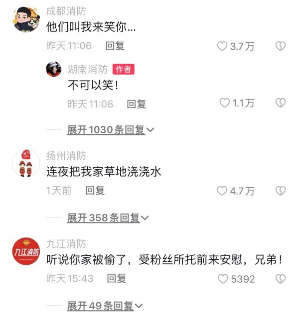 视频发出后,迅速引发网友关注,不少人调侃“湖南消防家被偷了”。还有其他地区消防救援队账号留言“连夜给我家草地浇浇水”。
