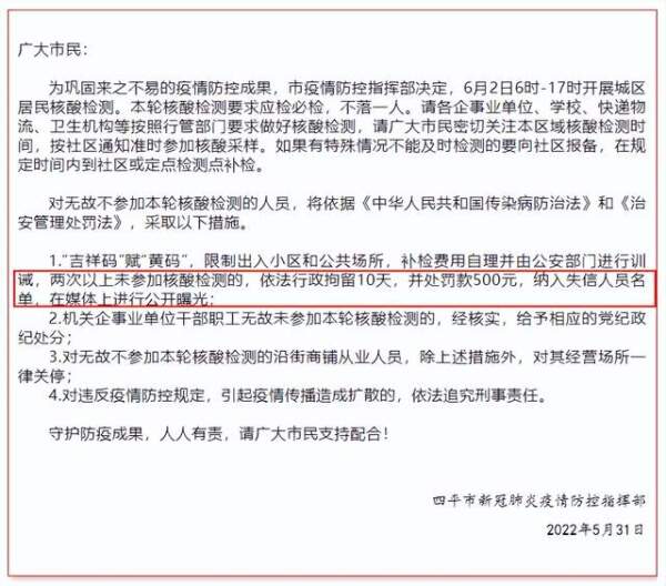 各地当前对未进行核酸检测者的管理或处罚规定也不一致。大部分地区会限制出行,但也有地区会进行更严格的处罚:31日,吉林四平发布《关于6月2日开展城区居民核酸检测的通告》称,两次以上未参加核酸检测者会被行政拘留10天、罚款500元,且还将被“纳入失信人员名单,在媒体上进行公开曝光”。