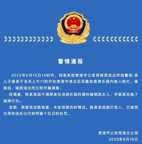 5月15日,广西贵港一男子在某儿童游乐场内连续怒摔男童,引发关注。16日,港北公安发布通报,称涉事男子已被行政拘留十五日。