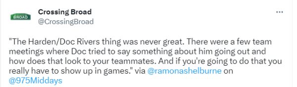 Shelburne的这番话,进一步证明了在东部半决赛期间,里弗斯只是在掩盖自己对哈登的不满情绪。首轮横扫篮网后,哈登出现在拉斯维加斯的夜店外,并被拍到和团队成员发生争吵,哈登还扇了对方一巴掌。