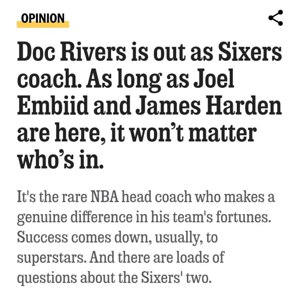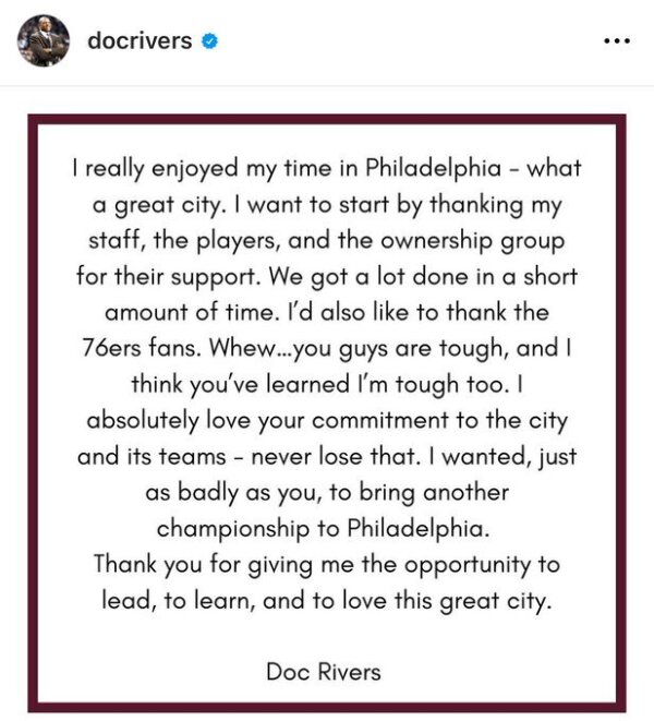 在76人官方宣布解雇里弗斯的消息后,里弗斯本人也发表声明,感谢费城、76人和球迷。他的执教能力,确实遭到很多质疑,数据也摆在那里,他是联盟历史上被逆转次数最多的教练。不过,换一个人来当主帅,真的就不一样了吗?