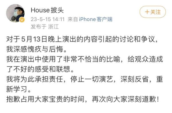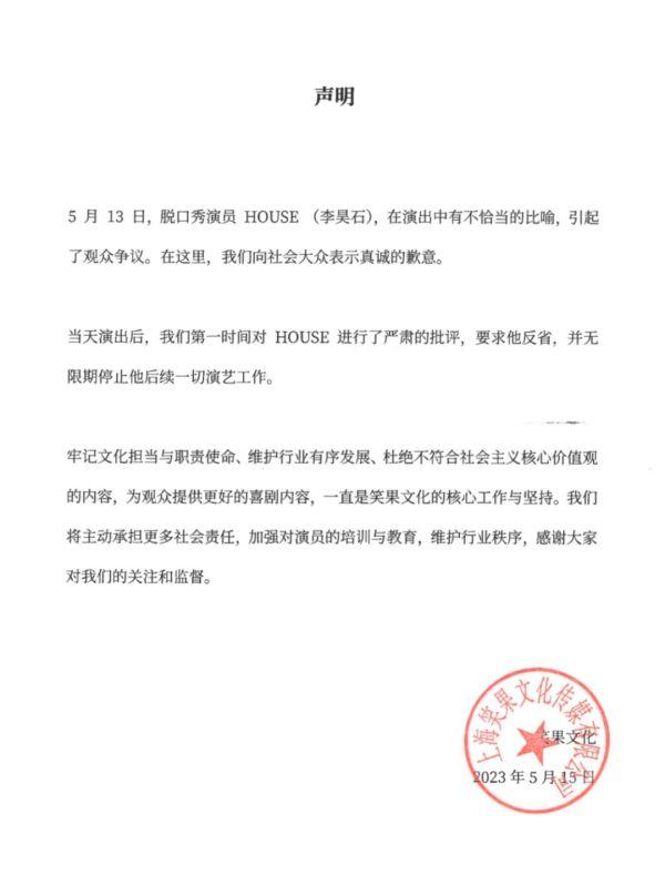 同日,涉事脱口秀演员House(李昊石)通过个人微博向网友致歉:我深感愧疚与后悔。我将为此承担责任,停止一切演艺,深刻反省,重新学习。