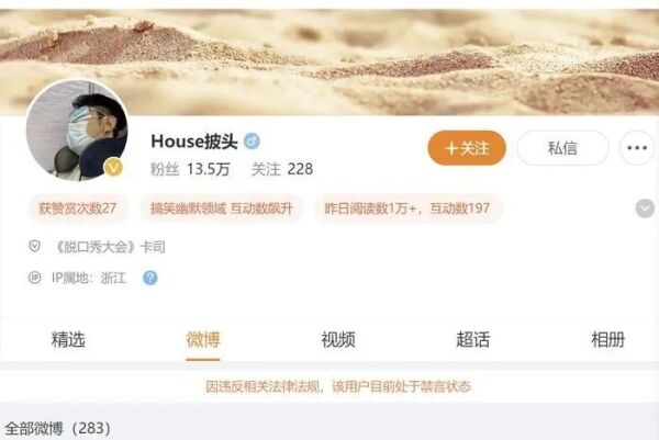 随后,李昊石个人微博(微博账号“House披头”)被禁言,页面显示“因违反相关法律法规,该用户目前处于禁言状态。”