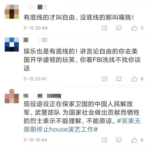 15日,笑果文化对外发布声明,针对5月13日线下演出中出现的演员言论不当的问题做出内部处理意见。@笑果官方bot 表示:当天演出后,我们第一时间对HOUSE进行了严肃的批评,要求他反省,并无限期停止他后续一切演艺工作。