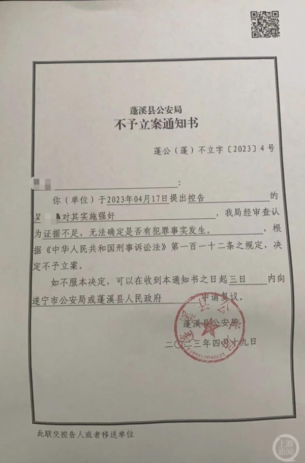 ▲蓬溪警方出具的不予立案通知书。图片来源/受访者供图