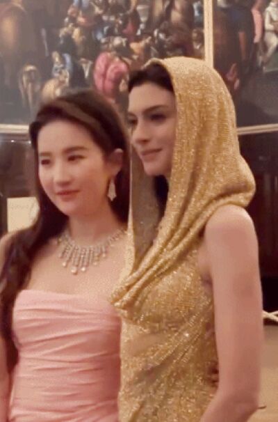 刘亦菲穿着一件粉色长裙,身材高挑窈窕,慵懒的发夹满头仙气十足。不但让人感到优雅,更是大方。还佩戴着宝格丽高级珠宝头饰,让她更加美丽动人。安妮海瑟薇则穿着一条金色长裙,非常简约时尚,带着宝格丽高级珠宝项链和耳环,全身洋溢着贵气和成熟女性的魅力!两位美女挨在一起,笑容灿烂,仿佛一对亲密的姐妹花。