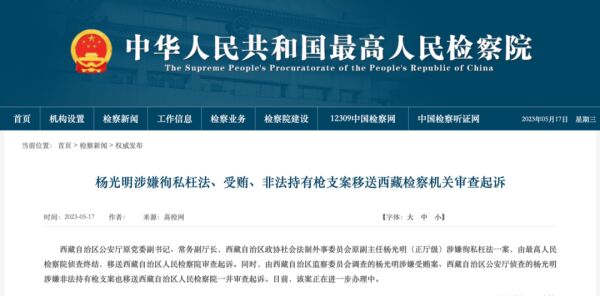 同时,由西藏自治区监察委员会调查的杨光明涉嫌受贿案、西藏自治区公安厅侦查的杨光明涉嫌非法持有枪支案也移送西藏自治区人民检察院一并审查起诉。目前,该案正在进一步办理中。