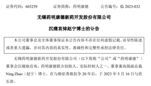 药明康德在公告中表示,联合创始人、实际控制人之一、董事兼高级副总裁Ning Zhao(赵宁),在与癌症勇敢抗争20年后,于2023年5月16日与世长辞。