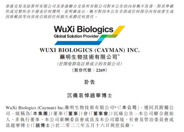 导读:5月17日早间,药明生物和药明康德分别在港交所和上交所发布公告称,联合创始人赵宁,在与癌症勇敢抗争20年后,于2023年5月16日与世长辞。