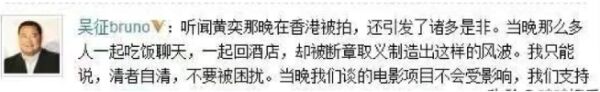 杨澜的老公吴征发文,称黄奕此行只是前往香港聊电影合作事宜,并非约见富商。但当时舆论纷纷,大家都相信了黄毅清的说法。