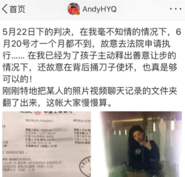 10月,法院判决两人离婚,女儿的抚养权归黄奕,黄毅清不满意,就在网上放出黄奕的私密照,企图用此证明黄奕的“X妇”身份。
