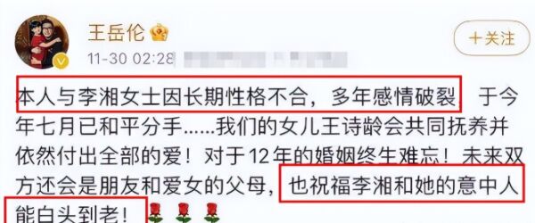 在声明末尾,王岳伦还专门提了一句:祝李湘和她的意中人能白头到老。