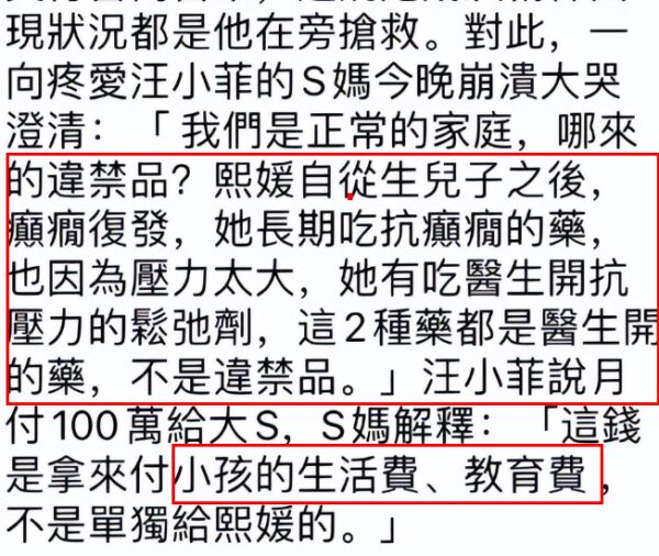 实际上,大S服用是医生开给她治疗癫痫的松弛剂,每月24万花费也是小孩子的生活费。