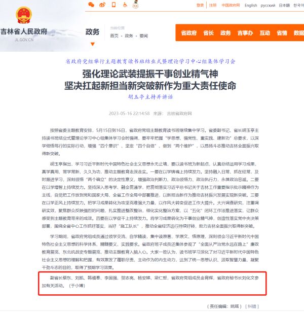 据吉林省政府网5月16日消息,按照省委主题教育安排,5月15日到16日,省政府党组主题教育读书班继续集中学习。文末提到,副省长蔡东、刘凯、韩福春、李国强、贺志亮、杨安娣、梁仁哲,省政府党组成员金育辉,省政府秘书长刘化文参加有关活动。