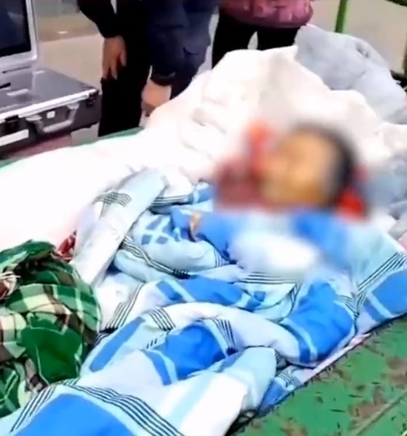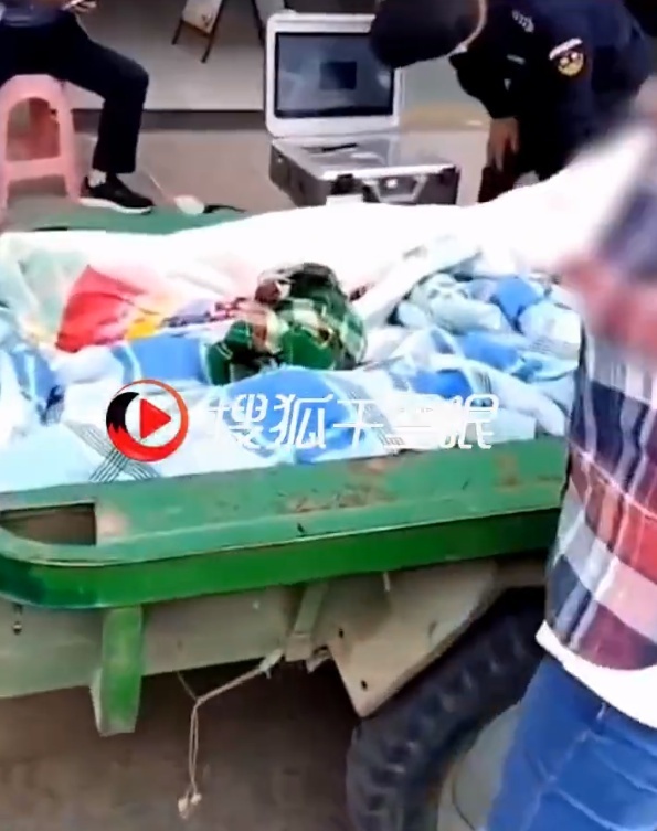 视频显示,在一家银行门口停着一辆三轮车,三轮车上铺着棉被,一名老人躺在上面。在老人身旁,银行工作人员拿着设备正在操作。