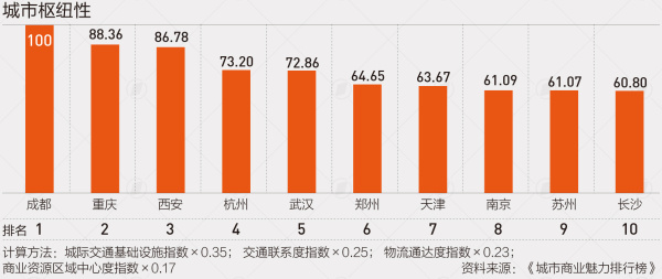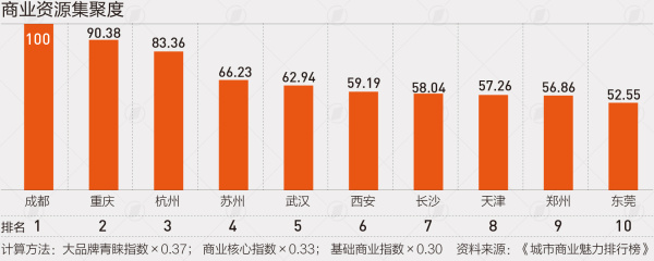 商业资源集聚度包含了大品牌青睐度、商业核心指数和基础商业指数3个二级维度,考量了城市受主流消费品牌青睐的程度、城市商圈的实力大小以及基础商业的成熟度。