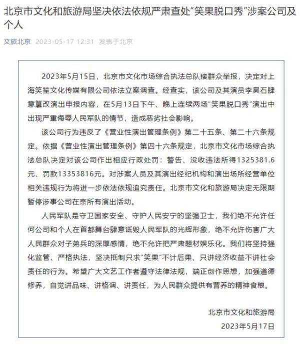 5月17日,北京文旅局公布对笑果文化处罚结果,没收上海笑笙文化传媒有限公司违法所得132万余元、罚款1335万余元,对涉案人员及其演出经纪机构和演出场所经营单位相关违规行为将进一步依法依规追究责任,无限期暂停涉事公司在京所有演出活动。
