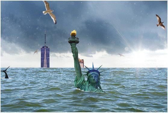 《纽约邮报》为这篇报道配有的一张动画效果示意图显示,纽约标志性的自由女神像半淹没在海水中,身后的纽约摩天大楼等建筑逐渐下沉被淹没。