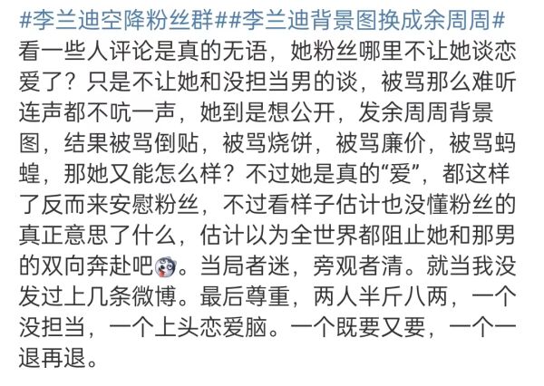 很多人都替李兰迪感到不值,甚至有粉丝怒其不争,喊话她:谈恋爱可以,非要和没担当的男人谈恋爱,人家是既要又要,你是一退再退,结果被男方粉丝骂倒贴,只能尊重祝福。