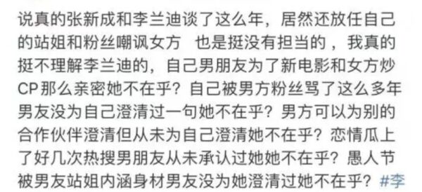 其实张新成这个态度也不是一天两天了,这也是李兰迪粉丝非常愤怒的原因之一。两人传绯闻已经好几年的时间了,整个过程中男方粉丝经常辱骂贬低女方,还在愚人节时开女方的身材玩笑,但是张新成从来没有引导规范过粉丝的言论,也没有任何表态。