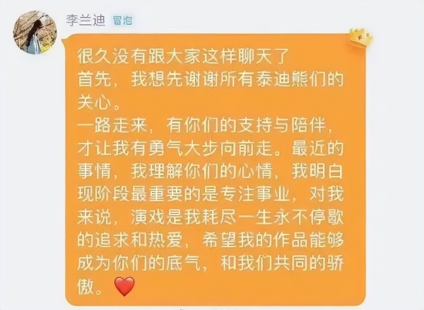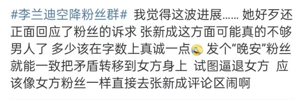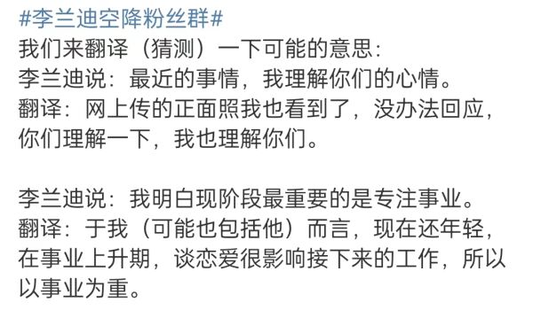 李兰迪这段话语全篇没有澄清与张新成的绯闻,也没有坚定表达自己不会谈恋爱的态度,只是模棱两可地安抚粉丝,也难怪大家都觉得这就是在承认恋情了。