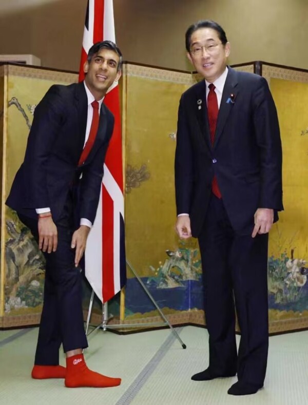 18日晚与岸田见面时,苏纳克展示他穿着的红袜子,图自日媒