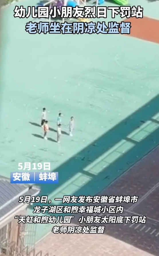 据辽沈晚报援引搜狐千里报道,5月19日,一网友发视频称,在安徽蚌埠一幼儿园内,小朋友在太阳下罚站,老师却坐在阴凉处监督。