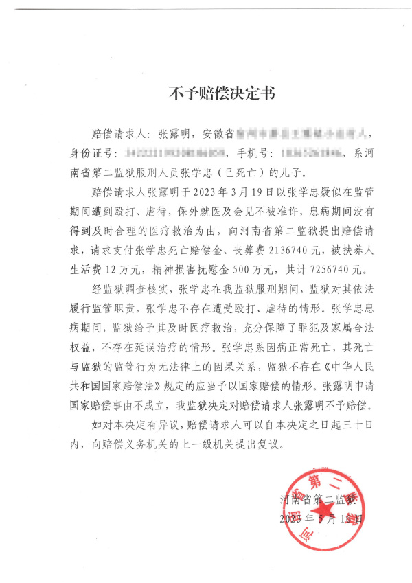 河南省第二监狱在《不予赔偿决定书》中表示,经监狱调查核实,张学忠在监狱服刑期间,监狱对其依法履行监管职责。张学忠不存在遭受殴打、虐待的情形。张学忠患病期间,监狱给予及时医疗救治,充分保障了罪犯及家属合法权益,不存在延误治疗的倾向。