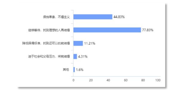 对待婚恋,青年人越来越不愿意将就了。调研小组向18岁至35岁的中青年发放出1466份问卷,其中,近8成的人坚持“继续等待,找到理想的人再结婚生子。”