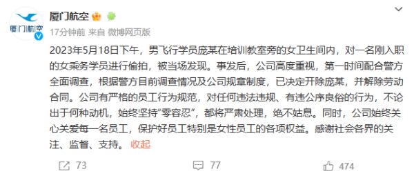 2023年5月18日下午,男飞行学员庞某在培训教室旁的女卫生间内,对一名刚入职的女乘务学员进行偷拍,被当场发现。事发后,公司高度重视,第一时间配合警方全面调查,根据警方目前调查情况及公司规章制度,已决定开除庞某,并解除劳动合同。公司有严格的员工行为规范,对任何违法违规、有违公序良俗的行为,不论出于何种动机,始终坚持“零容忍”,都将严肃处理,绝不姑息。同时,公司始终关心关爱每一名员工,保护好员工特别是女性员工的各项权益。感谢社会各界的关注、监督、支持。