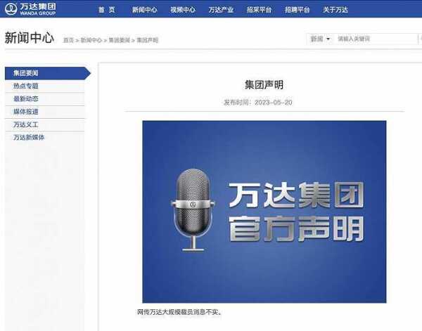 万达集团5月20日在官网发布声明称,网传万达大规模裁员消息不实。