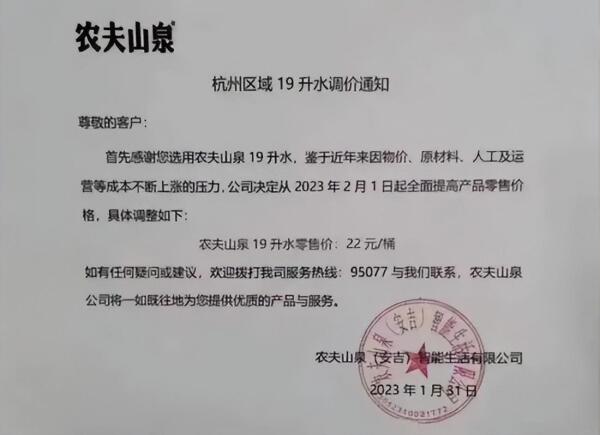 中新经纬注意到,最开始在业界流传的是一张农夫山泉《杭州区域19升水调价通知》,《通知》显示,因物价、原材料、人工及运费等成本不断上涨,2月1日起,杭州市19升桶装水价格调整为22元/桶。据悉,此前,杭州市19升农夫山泉桶装水的售价为20元/桶。