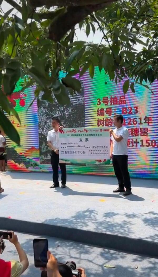 竞拍到采摘权后,中标人会怎么处理荔枝呢?何亚柱说,2022年,这棵千年古树的荔枝采摘权由一家公司拍得。据他了解,荔枝成熟后,这家公司并没有把荔枝拿去卖,而是和朋友、员工等一起分享了。