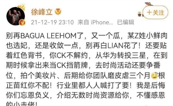 潇湘晨报记者注意到,此前造型师徐峰立曾发表与张艺兴相关言论,称其“选妃”、忘恩负义、人人喊打等,后删除相关微博道歉。张艺兴团队表示,会针对诽谤进行处理。