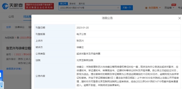 天眼查App显示,近日,北京互联网法院向徐峰立公告送达张艺兴与徐峰立等网络侵权责任纠纷一案诉讼材料及开庭传票,自公告之日起经过30日即视为送达,并定于举证期满后第3日在线上法庭开庭审理。