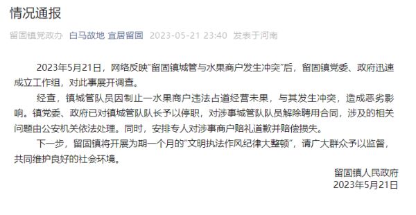 5月21日晚,留固镇人民政府发布通报称,2023年5月21日,网络反映“留固镇城管与水果商户发生冲突”后,留固镇党委、政府迅速成立工作组,对此事展开调查。