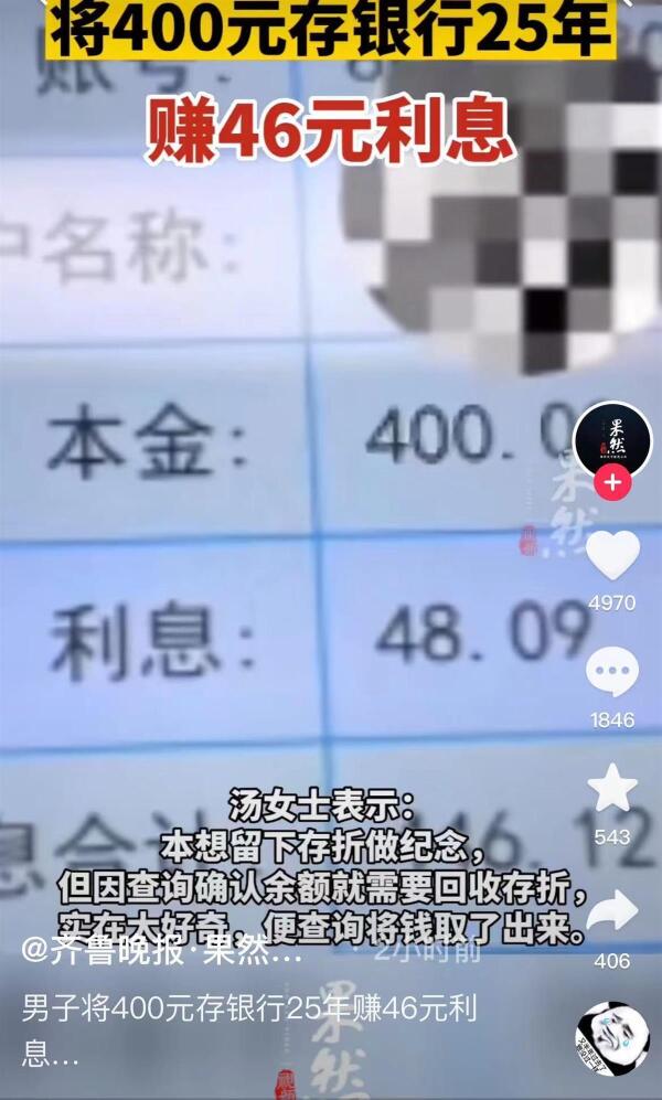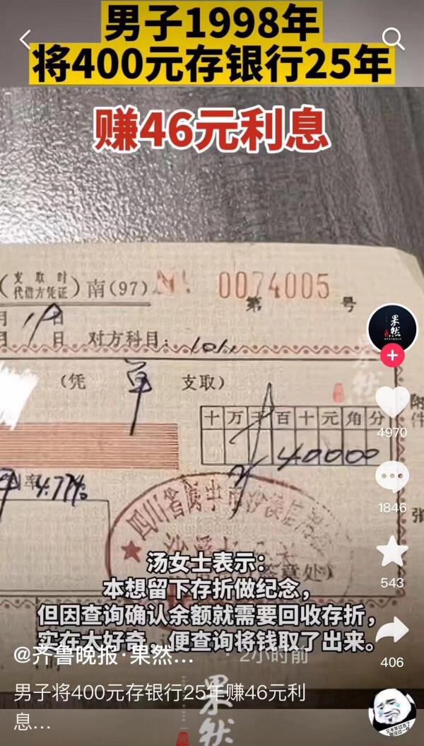 导读:近日,四川南充,汤女士父亲在整理老照片时,发现一张1998年的存折,本金是400元,查询后得知25年的利息为46.12元。