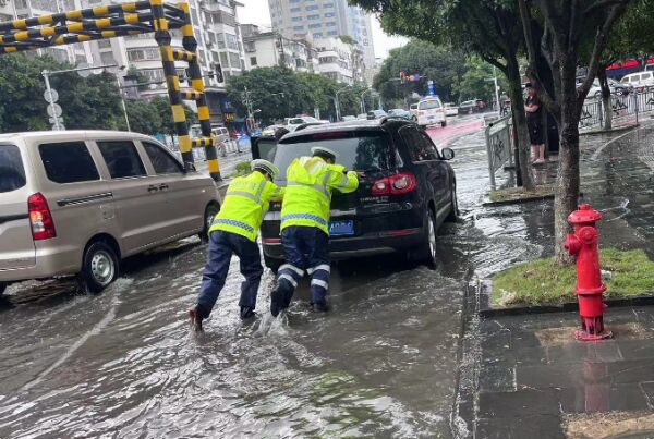 2023年5月22日,广西桂林,受暴雨影响,城市道路积水严重,交警在积水中合力手推一辆抛锚的汽车。广西桂林交警 图