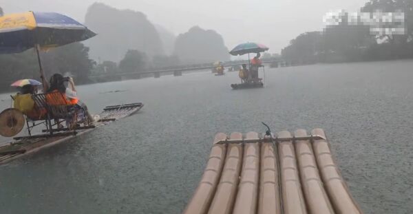 桂林水文中心今日8时发布信息,桂林局部地区日降雨量达193.0毫米。有游客在阳朔遇龙河漂流到一半时,遇上大暴雨。