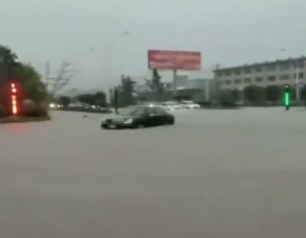 暴雨过后,城市道路积水严重,城区出现内涝,市民蹚水出行。